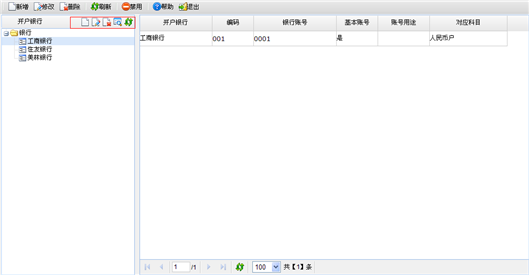 按钮,可新增开户银行。编辑数据完成后,点击〖保存〗按钮,即完成开户银行新增功能。如下图所示。