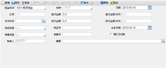 【主要功能】手工登记现金日记账功能。现金日记账新增页面如下图所示。