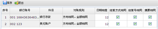 - 若在【银行期初】中定义“银行对账单余额方向”为贷方,则对账条件为方向相反、金额相等的日记账与对账单进行勾对,并且对应名称也该为:方向相反,金额相同。