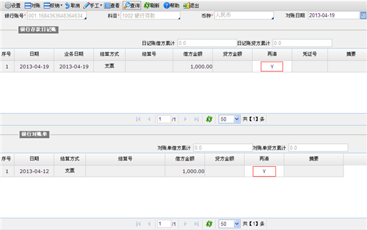 - 选中要对账的记录后,点击〖手工—手工对账〗按钮,系统进行对账。对账完成后,系统弹出对账成功提示。对账成功之后,两清状态由“√”转为“Y”状态。如下图所示。