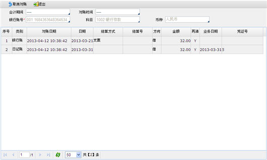 - 在银行对账页面,点击〖取消〗按钮,进入取消对账页面,如下图所示。