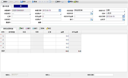 - 费用发票是对表头信息的细化,可以不维护,如果维护,则表头的“收款本币金额”需和明细表“本币金额”之和相等。