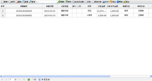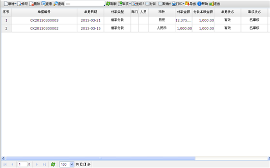 【主要功能】对其它付款单进行查询、修改、删除、审核等操作。如下图所示。其它付款单列表栏目按钮说明等具体操作请参见7. 2单据列表通用操作。