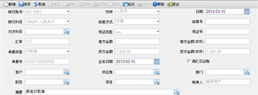 - 在日记账新增页面,进行相关栏目信息的录入,录入完毕后,点击〖保存〗按钮,完成其它付款单生成日记账。生成日记账时可将部门、业务员带入日记账的部门、职员。
