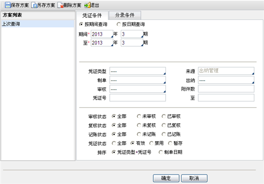 - 凭证条件:指按凭证类型、凭证来源、制单人、出纳人、审核人、凭证号、制单日期、会计期间等进行查询。