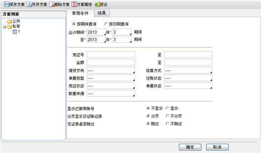 1. 根据菜单路径进入银行日记账打印条件选择页面,如下图所示。也可将查询条件保存到“方案列表”中,方便日后同条件查询。具体操作参见7.3.3账表查询条件说明。