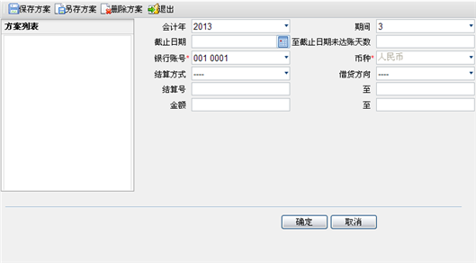 1. 根据菜单路径进入查询条件窗口,如下图所示。也可将查询条件保存到“方案列表”中,方便日后同条件查询。