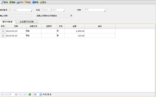 用户可以通过点击“银行对账单”和“企业银行日记账”页签切换显示不同查询内容。