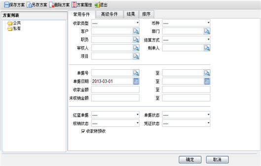 在查询条件过滤器页面,点击〖高级条件〗菜单按钮,进入高级条件查询页面,以收款单为例,查询页面如下图所示。