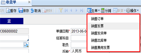支持从销售业务单据自动生成收款单,与业务单据集成使用,方便数据的追踪分析;做收款时可通过〖生单〗功能选择来源业务单据自动形成收款单,如下图。