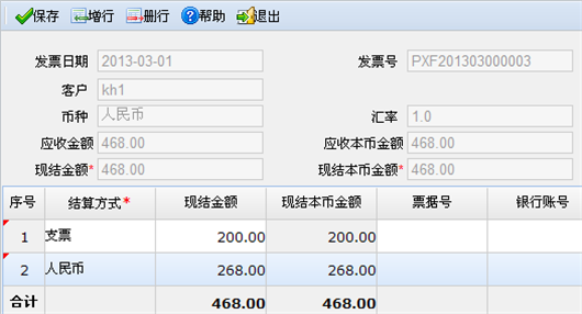 - 现结界面,客户、币种、汇率、应收金额、应收本币金额取自发票的相应的数据项值,不可编辑,应收金额取对应的发票金额,应收本币金额取对应发票的本币金额。现结金额=行中的现结金额合计、现结本币金额=行中的现结本币金额合计,不可编辑。