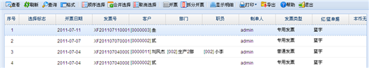 - 点击〖合并选择〗按钮,系统自动将所有行选择标志列的值设置为1。此分组模式表示将列表中全部发票合并开具为一张税控发票。