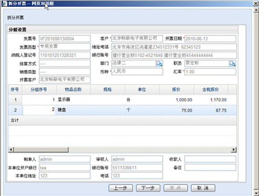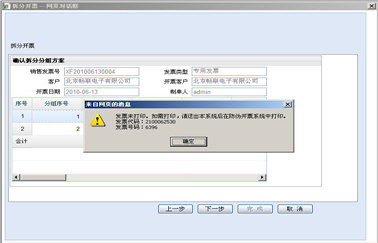 - 必须将全部发票明细行进行分组,否则系统提示“当前发票明细行未完全分组,无法执行拆分开票”;