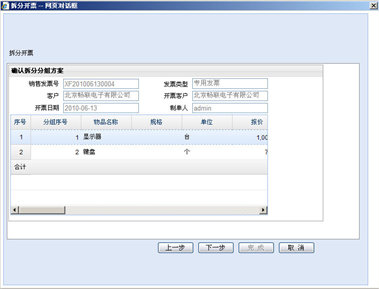 【第三步】分组设置完成之后,点〖下一步〗,系统进入拆分开票的确认拆分开票方案界面,如下图所示。