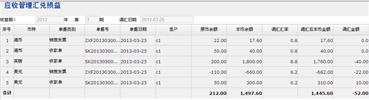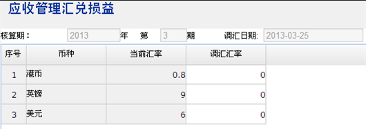 3.初始界面:查询本核算期的期间,年度、期间默认当前的应收管理期间,操作员不能修改期末调汇的年度、期间。 行中的币种当前汇率根据总账的参数定义的汇率使用规则,调整汇率默认=调整汇率,允许维护,其它属性不能维护。