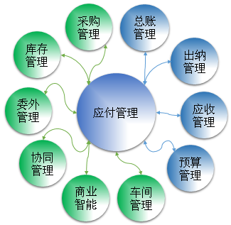 应付管理子系统可以单独应用,也可以分别与采购管理、委外管理、车间管理、出纳管理、总账管理等子系统中的一个或几个子系统集成应用。