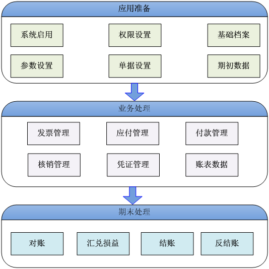 用户在初次使用应付管理子系统时,需要先做应用准备、再进行日常业务处理、期末处理。操作流程图如下图所示。