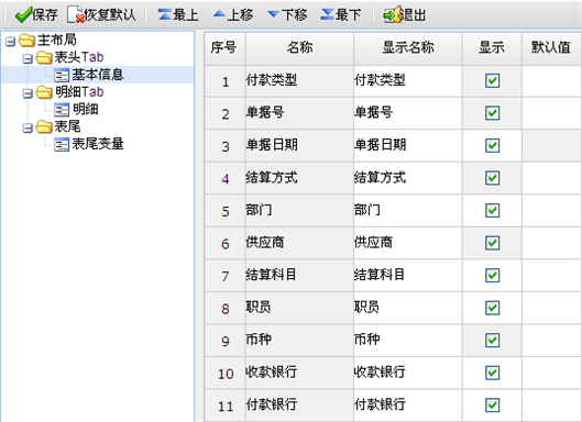 3.点击“默认值”,可对具体项目设置默认显示的值,新增单据时,该默认值自动带出。
