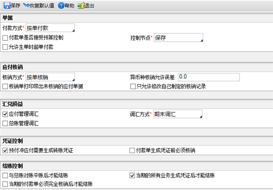 总账管理调汇 | 若勾选,则说明是在总账管理里面做汇兑损益,应付的汇兑损益功能不可用。 |