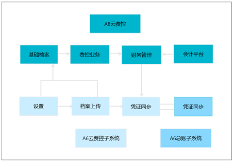 - A6云费控子系统通过设置和A8云费控系统进行用户、财务组织、数据库的关联;