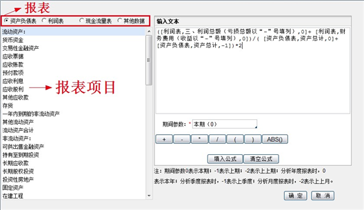 【第三步】编辑公式填入到文本框中。先选择报表并选择此报表中的报表项目,再选择期间参数,然后点击〖填入公式〗按钮。同样的方法,可以再确认其他的公式项目,再通过运算符号进行公式的编辑。