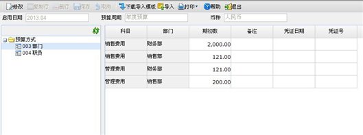 4) 在期初累计预算界面,针对已经有的期初预算数据行,可以进行修改、复制行、删行等操作;
