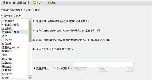 1)在科目管理界面,点击〖导入〗按钮,系统弹出行业会计制度设置窗口,此页面已经预设了四十多种不同行业的科目体系,可以根据需要选择相应的科目体系导入系统,也可以将公司已有的科目体系在EXCEL文件中进行整理,并导入系统。如图所示