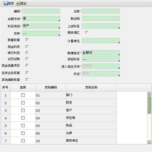 3)输入会计科目的代码、名称、余额方向、科目类别等信息。代码、名称、余额方向、科目类别为必输项,对于有辅助核算的科目直接在相应的核算项目处打“√”;