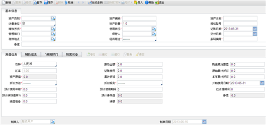 记账日期:期初卡片记账日期要小于固定资产模块启用时间,一般默认为前一期间的最后一天,用户可根据实际情况进行修改。其它栏目的说明见卡片新增。