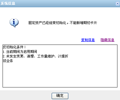 图3-5 已经结束初始化录入期初卡片的提示信息