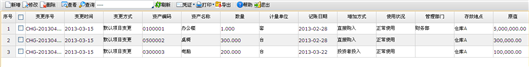 - 系统默认列表显示的属性:变更序号、变更时间、变更方式、资产编码、资产名称、数量等信息。