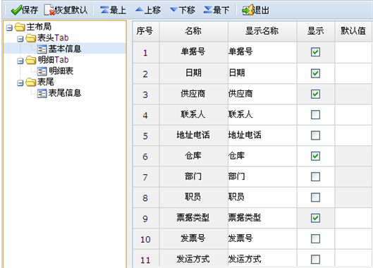 4 并用鼠标单击【上移】、【下移】、【最上】、【最下】按钮,调整此项目在单据中显示的位置。