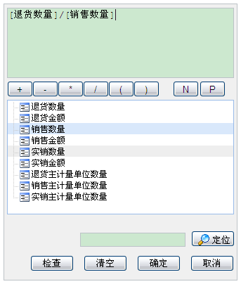 1 选中“退货数量”,双击,“退货数量”即显示在公式里,输入退货数量/销售数量,点击确定,列表1的公式即为退货数量/销售数量。