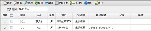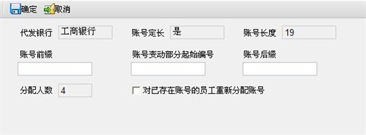 采用银行代发工资方式时,需要设置职员的代发银行卡号。在人员档案中提供手工录入职员银行卡号的功能,当职员银行卡号存在一定规律时,可以通过帐号分配功能实现职员银行卡号的批量录入,提高工作效率,同时避免了由于手工输入造成的错误。