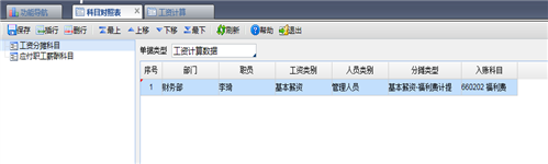 点击工资管理/基础数据/科目对照表,进行对科目对照表的设置。如图所示