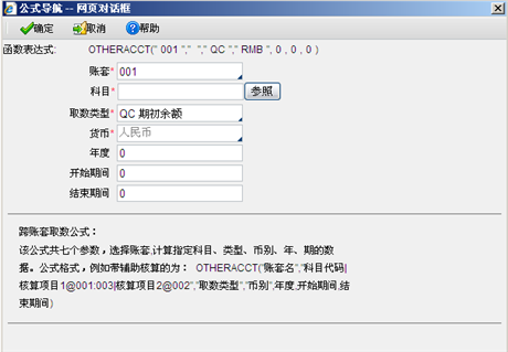 公式“OTHERACCT”除了取数来源是其他账套总账管理录入的凭证,其他参数均与“ACCT”公式相同。公式导航页面如下图所示: