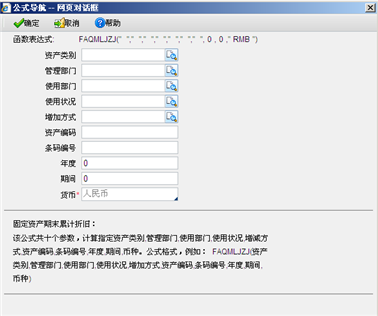 公式“FAQMLJZJ”可以根据不同的参数设置,计算截止到参数设置的期间为止,选取的固定资产卡片累计计提的折旧。