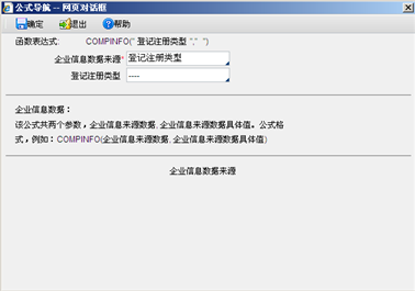 公式“COMPINFO”主要用于涉税会计模块税额计算以及纳税分析的部分公式中,起一个辅助判断的作用。根据参数设置,判断选择的参数信息与企业基本信息设置的企业“登记注册类型”、“所属行业”、“行业会计制度”(即会计核算方法)信息是否相符,公式比较后返回不同结果(0或者1)。