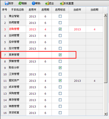 点击“我的系统/基础设置/系统启用”菜单项,进入系统启用管理页面。如图所示:报表管理子系统默认启用,且没有启用期间的具体标示。如下图所示: