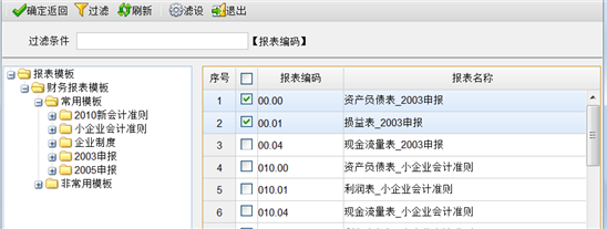 点击“加载模板”按钮,系统会自动弹出加载预置的报表模板页面,单选或多选需要加载的报表模板,点击“确定返回”按钮,或者双击需要加载的模板,即可。加载页面如下图所示: