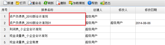 系统支持重复加载报表模板,例如,系统已经自动加载了企业会计准则的资产负债表模板,继续选择此模板加载,系统提示“当前行业报表已存在,是否加载副本”,点击确定后,系统自动导入预置的企业会计准则的报表模板。原来已存在的报表模板会自动修改名称为“资产负债表_2010企业会计准则01”,如下图所示: