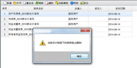 - 不允许修改当前默认会计制度的报表名称,否则提示:“当前会计制度下的报表禁止修改报表名!”