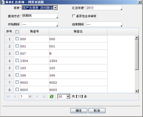 - 账套,查询页面的下部分为服务上的其他账套,选择其他账套可以将其他账套上的报表模板汇总生成一张报表。