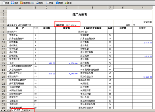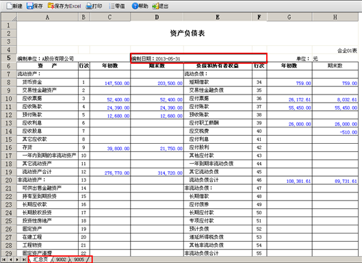 - 如上图所示,选择的9002账套和9005账套中若已生成2013年5月份的资产负债表_2010新企业会计准则的报表,则汇总后,可以将两个账套中报表的数据汇总加计到“汇总页”的报表页签上,页签“9002”和页签“9005”分别为9002账套和9005账套中已生成2013年5月份的资产负债表-2010新企业会计准则的报表内容。