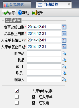 【第二步】选择自动结算过滤条件。如起始日期、截止日期、供应商以及结算的单据类型(入库单和发票、蓝红入库单、蓝红发票)等。