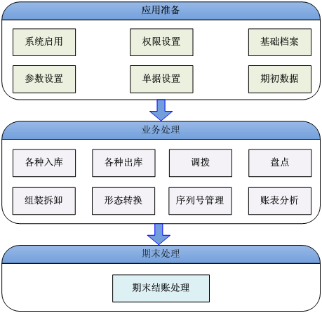 用户在初次使用库存管理子系统时,需要先做应用准备、再进行业务处理、期末处理。操作流程图如下图所示: