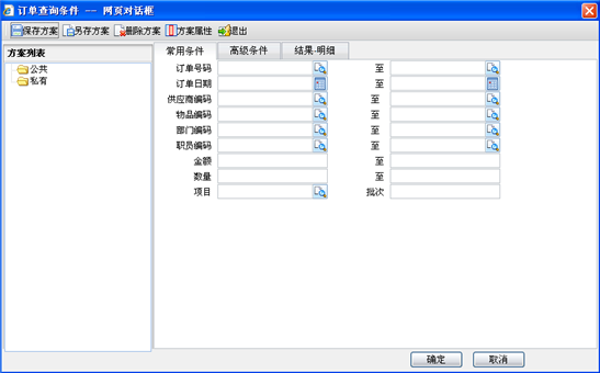 【第二步】输入查询条件,包括常用条件以及高级条件,也可通过{结果-明细}对列表显示项目进行设置,具体操作方法可参见通用操作-单据列表-查询条件说明,输入完毕后点击〖确定〗,将符合条件的采购订单以列表形式显示,如下图所示。