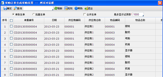生单是指在单据页面,通过〖生单〗按钮新增单据的操作。下面以采购发票选择采购订单生单为例,介绍单据的生单操作以及生单规则。