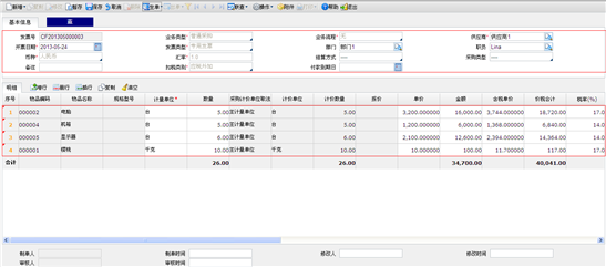 【第三步】选中一行或多行采购订单,点击〖确定〗按钮,回到采购发票新增界面,表头带入已勾选订单的供应商信息,表体带入已勾选订单的物品行信息,如下图所示。