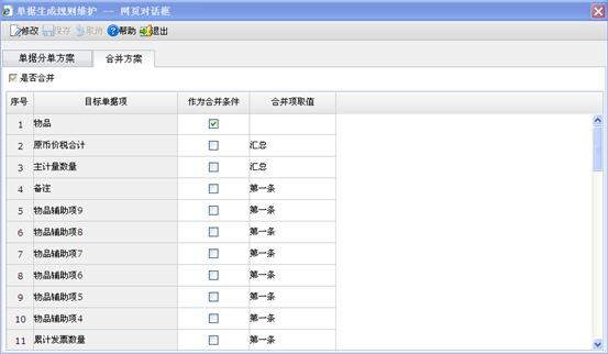 单据生成规则设置分为{分单方案}以及{合并方案}两个页面。{分单方案}可以对表头以及表体的来源单据项是否作为分单条件进行设置,如上图所示。{合并方案}对目标单据项是否作为合并条件以及合并项取值进行设置,如下图所示。
